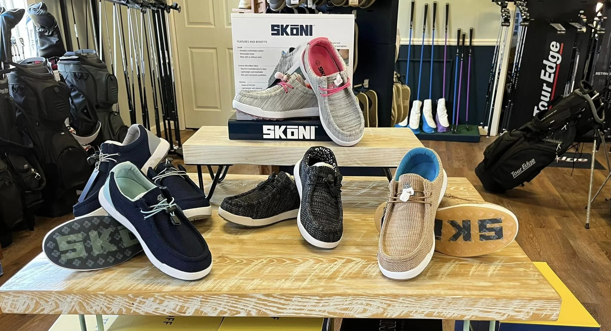 Check out our pro shop, where we carry a selection of top-quality golf gear, including Tour Edge Golf Clubs, Sunday Bags, Olukai Golf Shoes, and Skoni Golf Shoes. Whether you're looking for the latest equipment or stylish footwear for your next round, we have you covered with our range of options to suit every golfer’s needs and preferences. Visit our pro shop today to gear up for your best game yet!